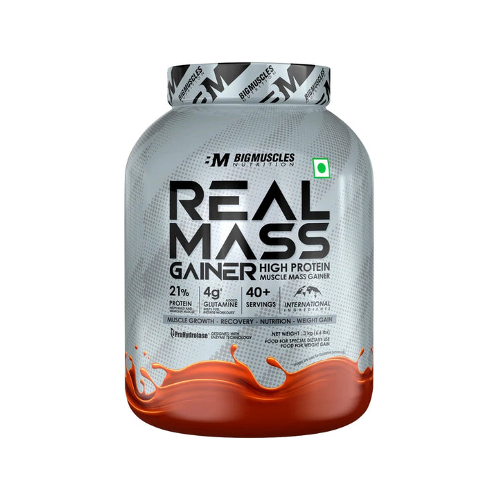 BigMuscles Real Mass Gainer Contains:- Maltodextrin, Protein Blend (Skimmed Milk Powder, Soya Protein Isolate, Whey Concentrate, Milk Protein Concentrate, Whey Protein Isolate), Starch, Whole Milk Powder, Sucrose, Cocoa, BCAA, L-Glutamine, Sucralose, Preservative (E211) and Thickener (415). CONTAINS NATURAL AND NATURE-IDENTICAL FLAVOURING SUBSTANCES. ALLERGENS: Milk, Wheat, and Soy.